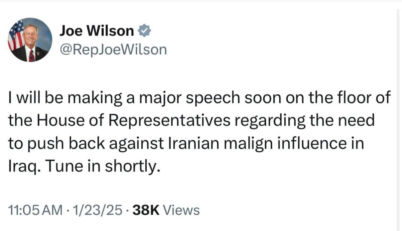ويلسون وفي تغريدة على حسابه في "أكس"، قال، ساقدم خطابا في مجلس النواب يتعلق بمواجهة النفوذ الايراني الخبيت في العراق.