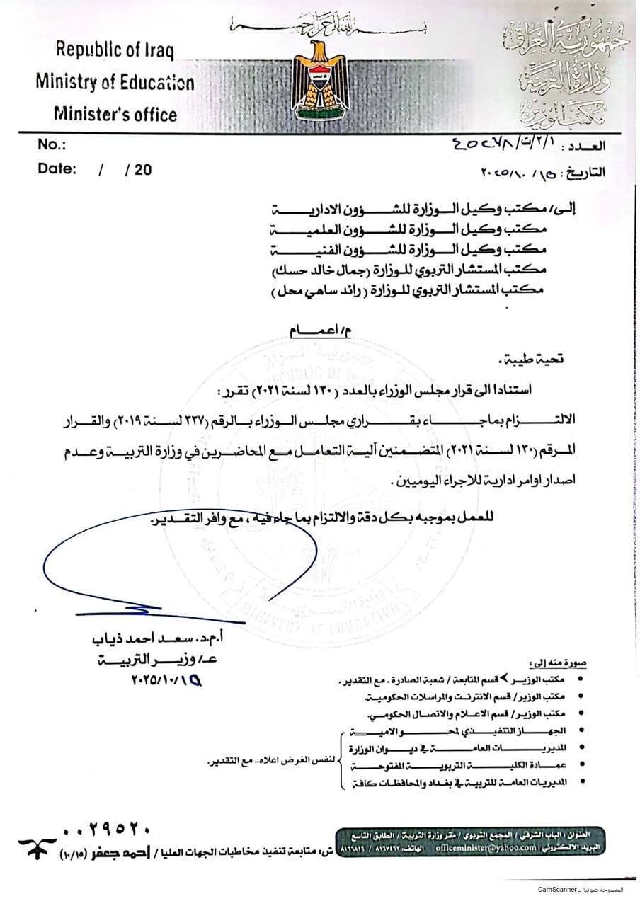 وشدد وزير التربية على ضرورة تفعيل دور المديرية العامة للإشراف التربوي والبدء بتكثيف المتابعة الميدانية عبر المشرفين للوقوف على مدى تطبيق هذا التوجيه في خطوة "بحسب ماجاء في البيان" تهدف الى تحقيق العدالة الوظيفية وتنظيم العمل التربوي.