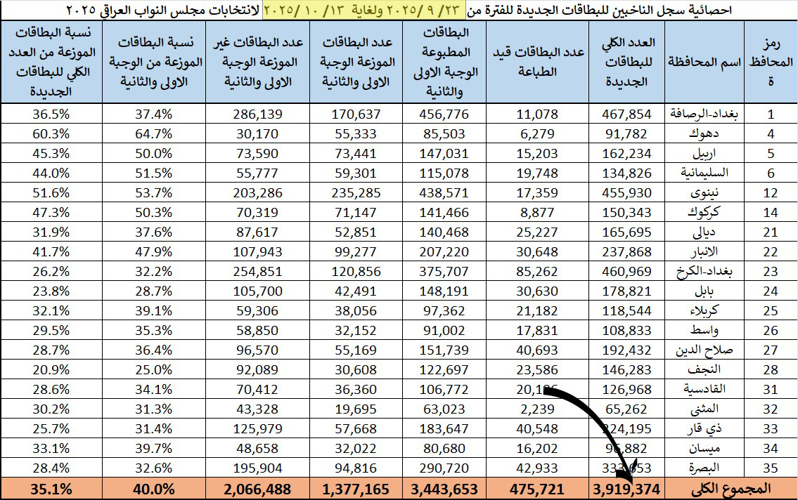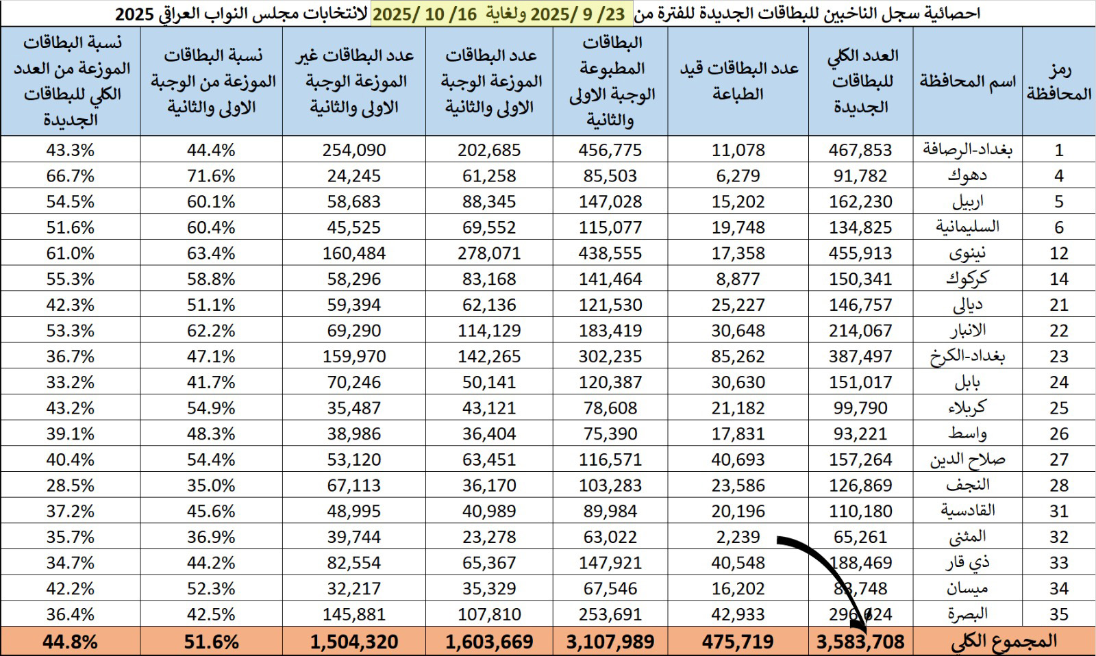وبحسب احصائية اعلنتها المفوضية للفترة من 23-9 وحتى يوم 13-10، فأن العدد الكلي للبطاقات الجديدة، بلغ نحو 3 مليون و919 ألف بطاقة، فيما اظهرت احصائية اخرى، من تاريخ 23-9 وحتى 16-10، رقما أقل من الرقم السابق، حيث بلغ عدد البطاقات الجديدة، بحسب هذه الاحصائية 3 ملايين و583 ألف بطاقة.