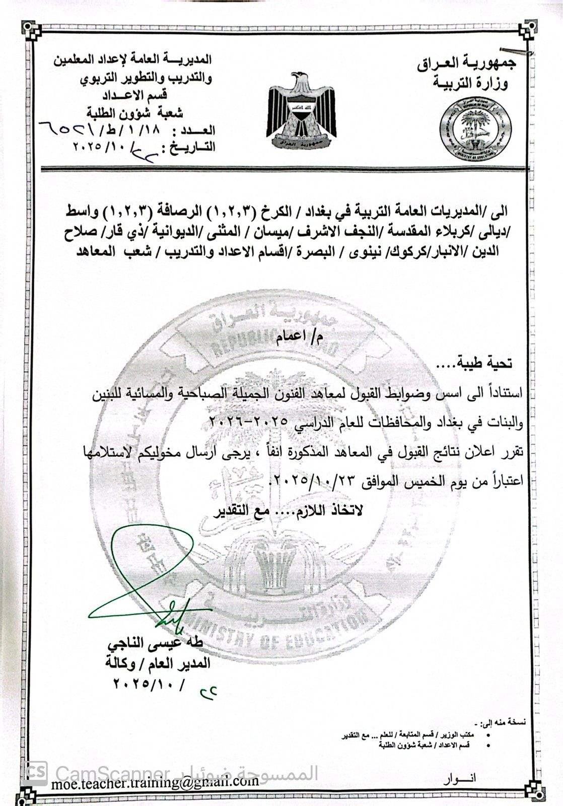 ووفقا لوثيقة رسمية حصلت عليها "النهرين" أن "يوم غد الخميس سيشهد إعلان نتائج القبول في معاهد الفنون الجميلة كافة / بنين وبنات / صباحي ومسائي / للعام الدراسي ٢٠٢٥_٢٠٢٦".