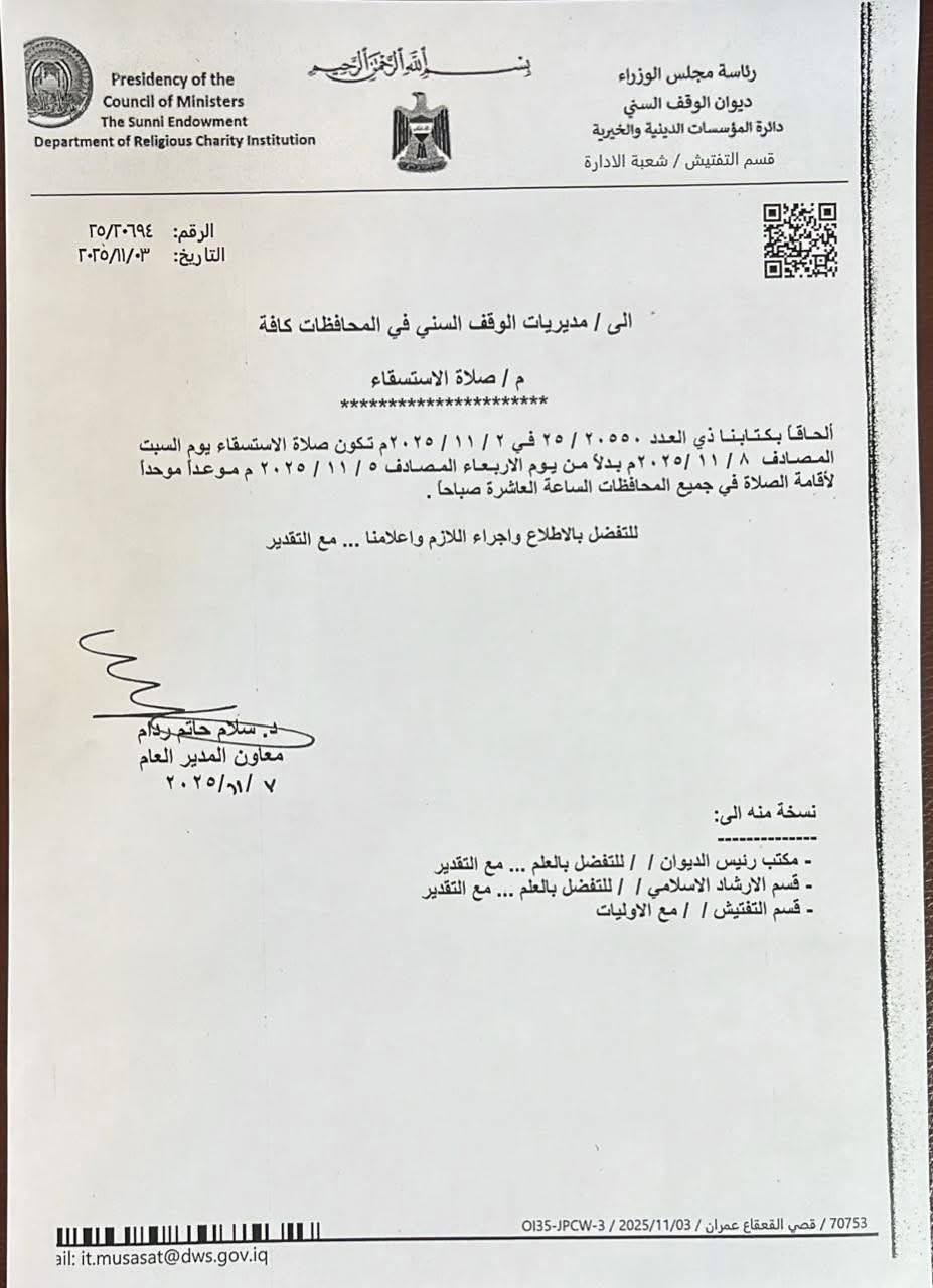 في يوم الصمت الانتخابي .. ديوان الوقف السني يقيم صلاة الاستسقاء يوم السبت