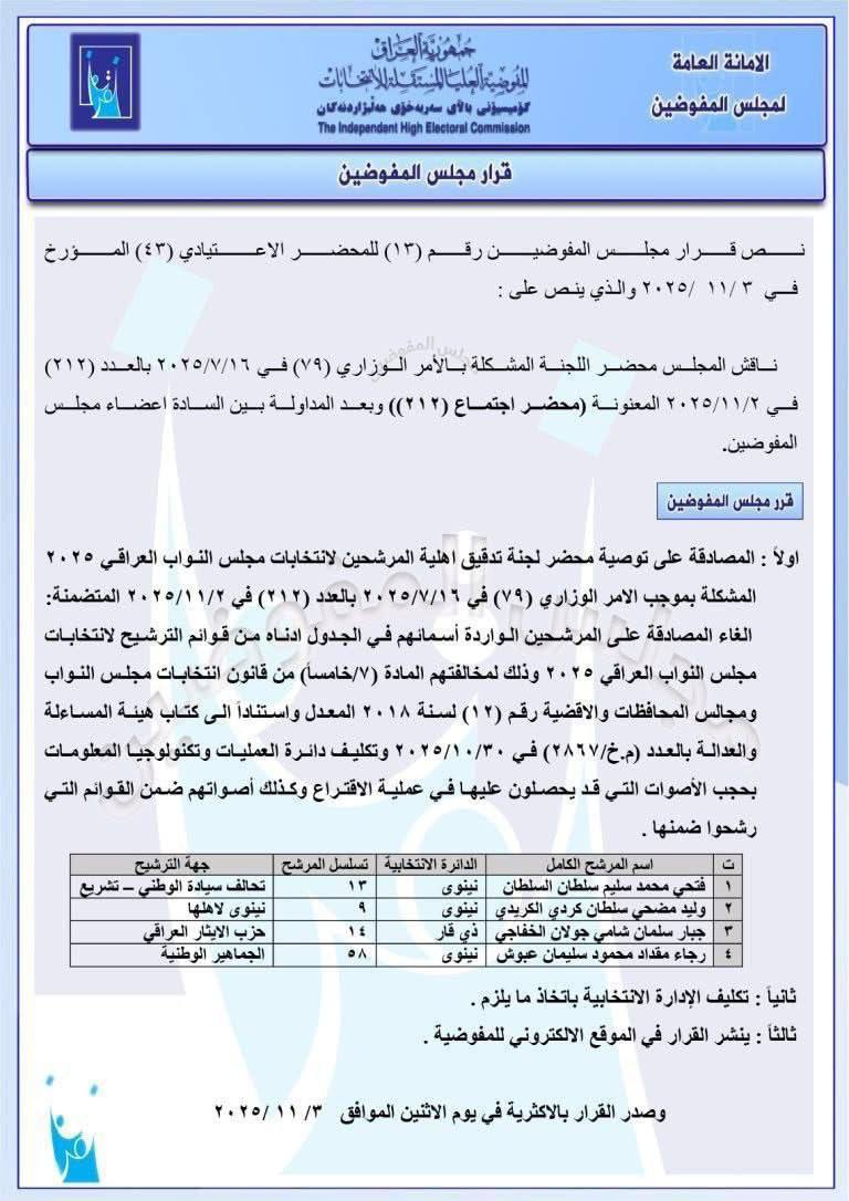 قناة  النهرين الفضائية - اسبعدت المفوضية العليا المستقلة للانتخابات 4 مرشحين للانتخابات إثر قيامهم بمخالفات قانونية.