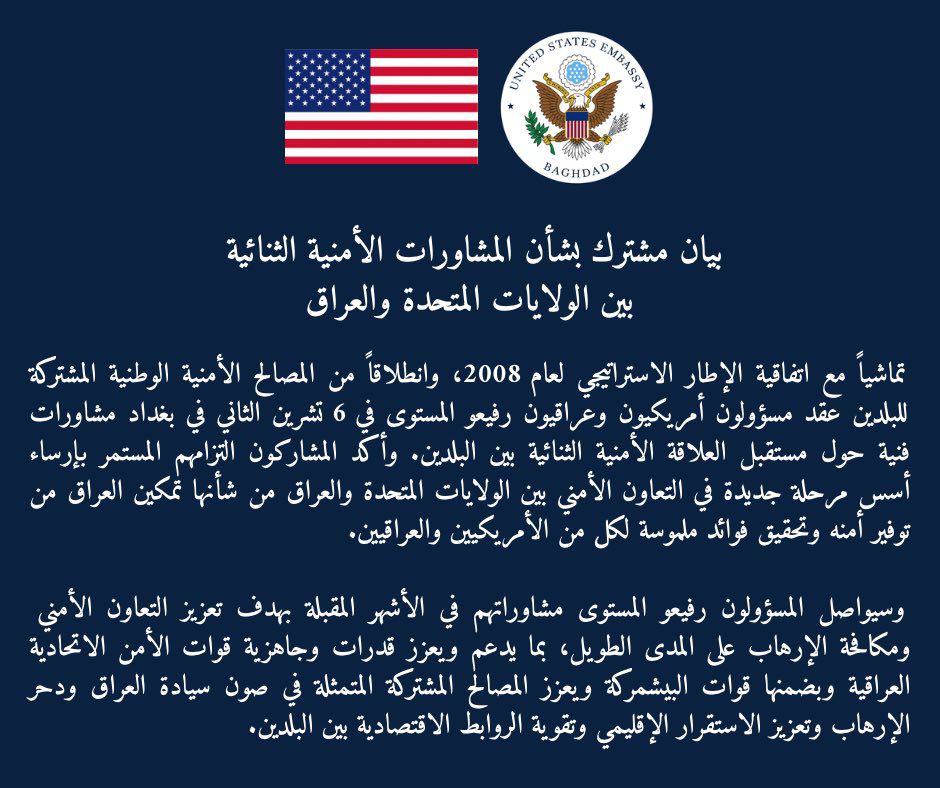 قناة النهرين الفضائية - تماشياً مع اتفاقية الإطار الاستراتيجي لعام 2008 وانطلاقاً من المصالح الأمنية الوطنية المشتركة للبلدين عقد مسؤولون أمريكيون وعراقيون رفيعو المستوى في السادس من تشرين الثاني 2025 في بغداد مشاورات فنية حول مستقبل العلاقة الأمنية الثنائية بين البلدين وأكد المشاركون التزامهم المستمر بإرساء أسس مرحلة جديدة في التعاون الأمني بين الولايات المتحدة والعراق من شأنها الاستمرار في تمكين العراق الاتحادي من توفير أمنه وتحقيق فوائد ملموسة لكل من الأمريكيين والعراقيين.