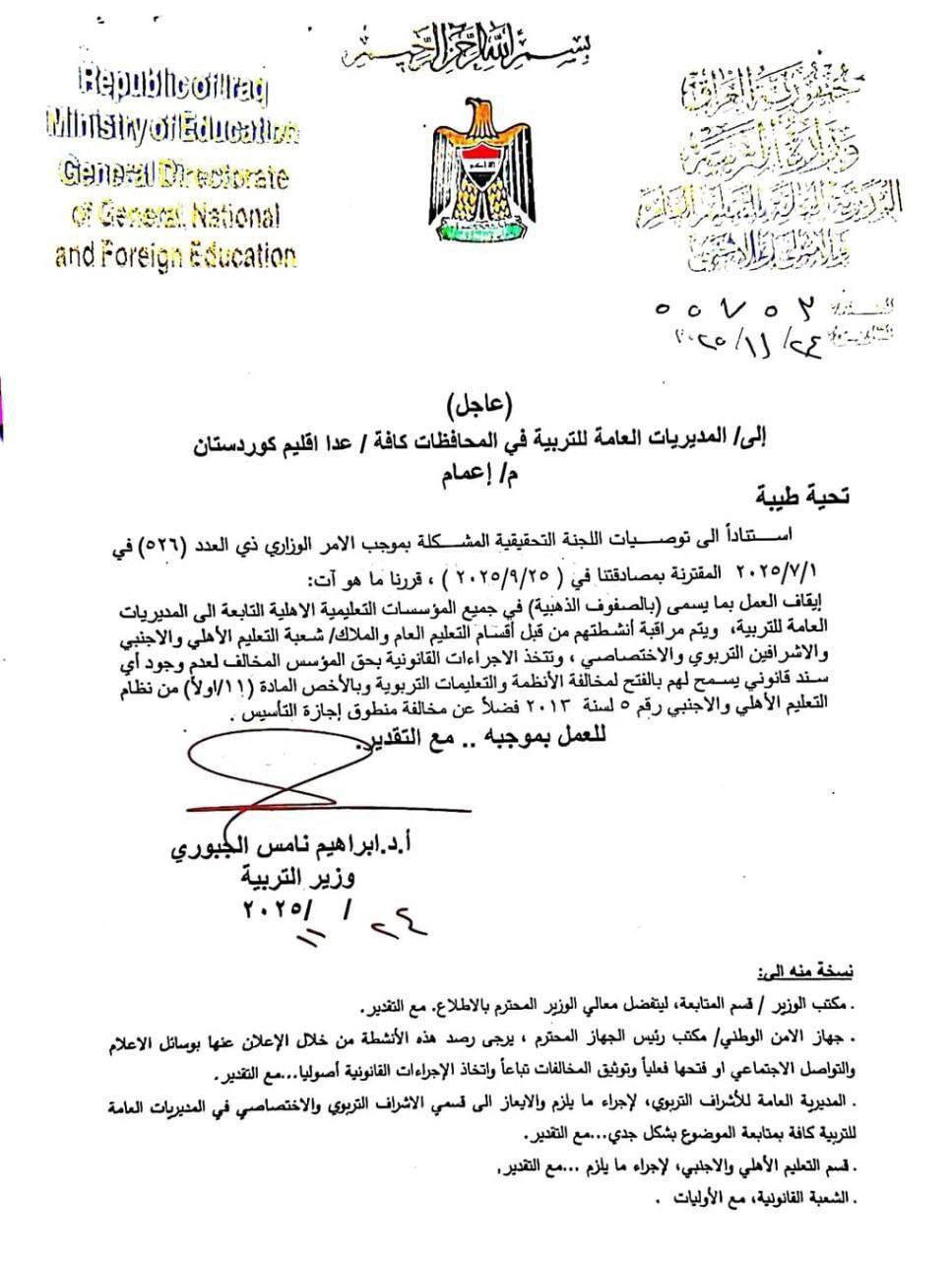 التربية توقف العمل بالصفوف الذهبية لكافة المدارس الأهلية و تلوح بالعقوبة للمخالفين