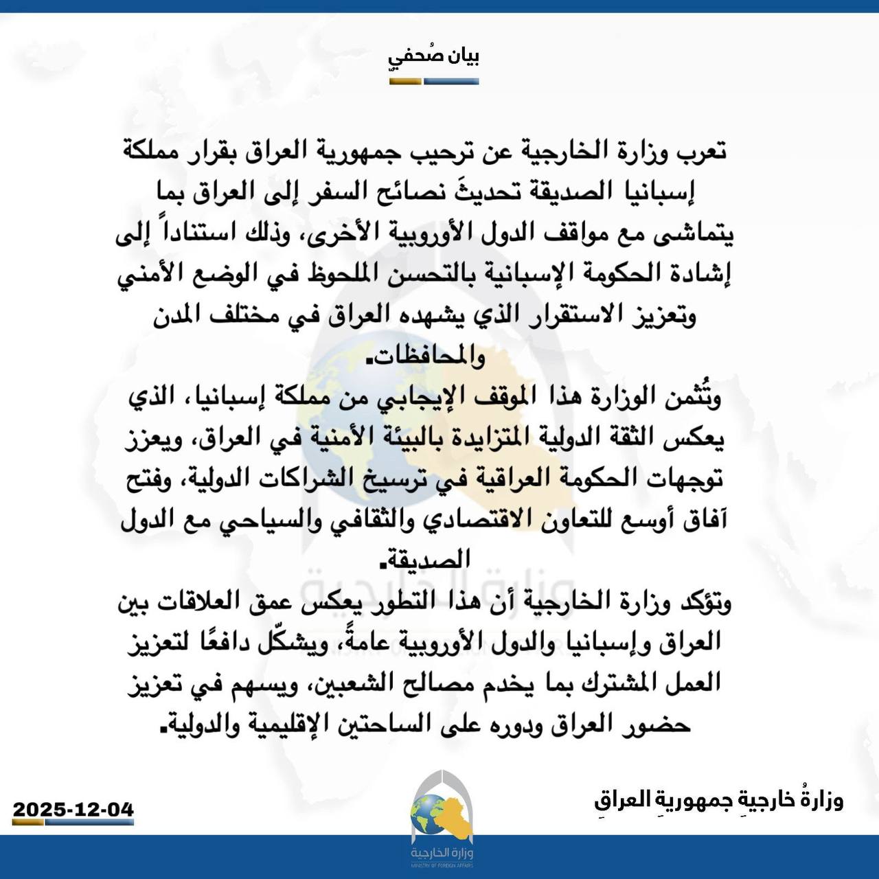 وأكدت الوزارة، أن "هذا التطور يعكس عمق العلاقات بين العراق وإسبانيا والدول الأوروبية عامةً، ويشكّل دافعًا لتعزيز العمل المشترك بما يخدم مصالح الشعبين، ويسهم في تعزيز حضور العراق ودوره على الساحتين الإقليمية والدولية".
