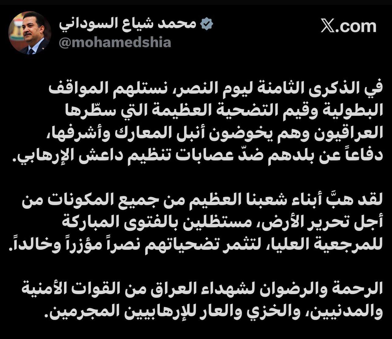 السوداني يستذكر بطولات النصر ويحيّي تضحيات العراقيين في مواجهة داعش