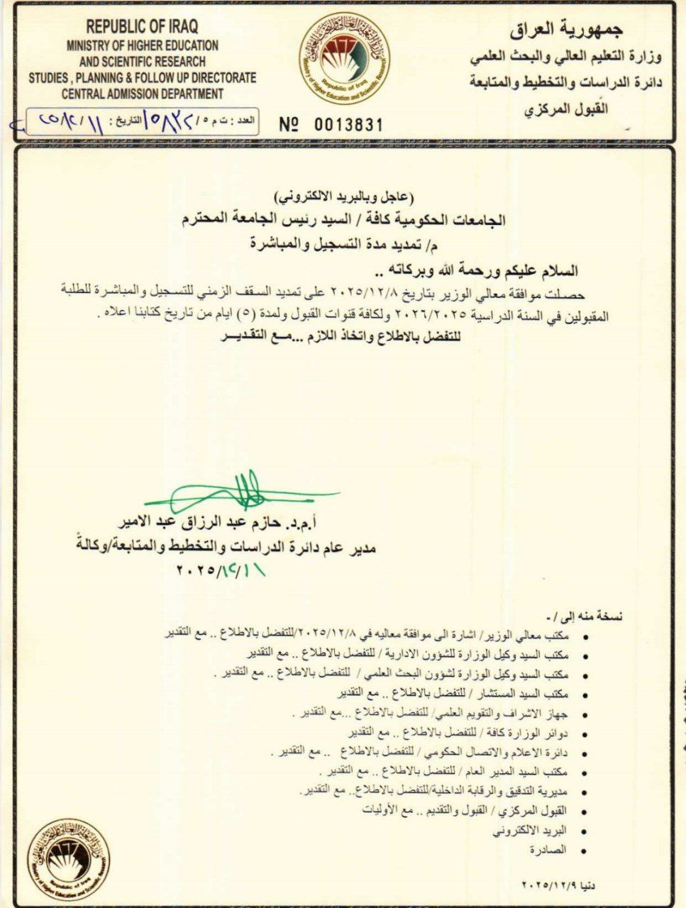 التعليم تقرر تمديد مدة التسجيل والمباشرة لطلبة القبول المركزي خمسة أيام