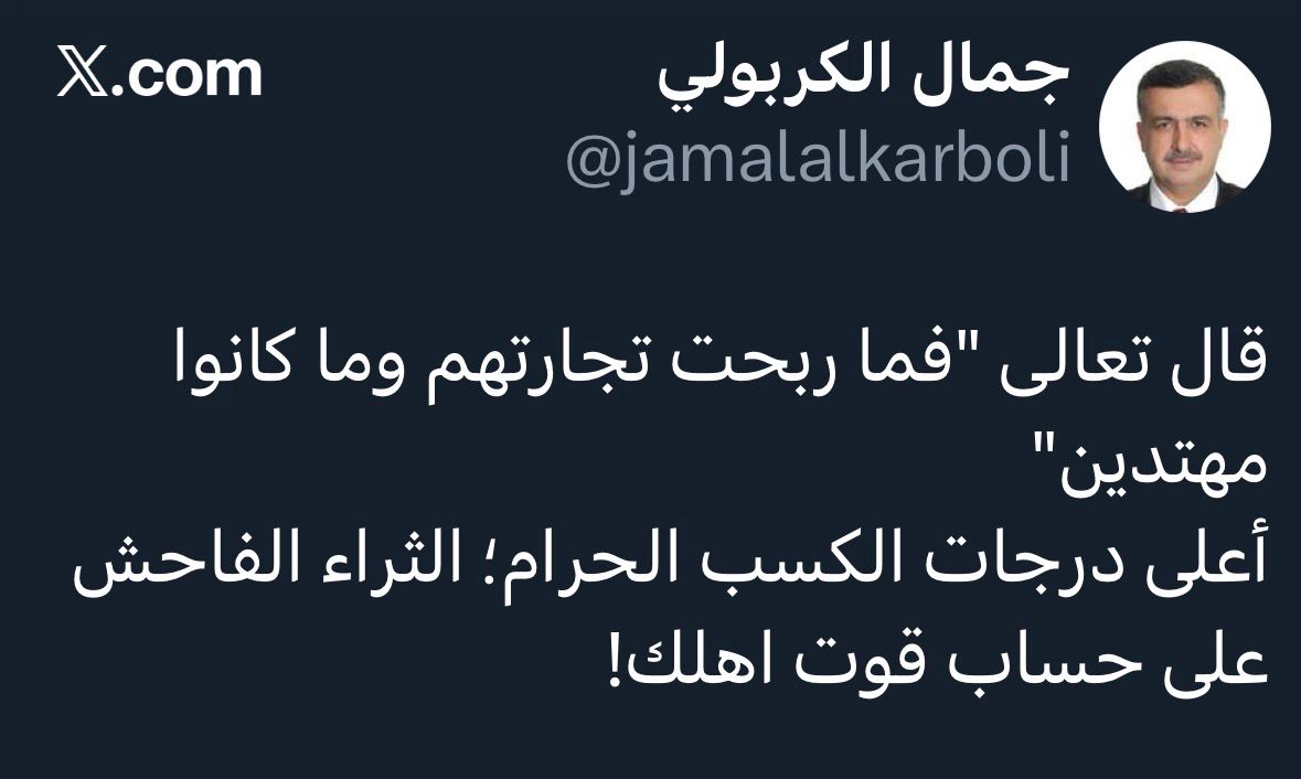 الكربولي، وفي منشور مقتضب له، على منصة أكس، أوضح ان "اعلى درجات الكسب الحرام، هو الثراء الفاحش على قوت أهلك"، مستشهداً بآية قرانية قال فيها تعالى "فما ربحت تجارتهم وما كانوا مهتدين".