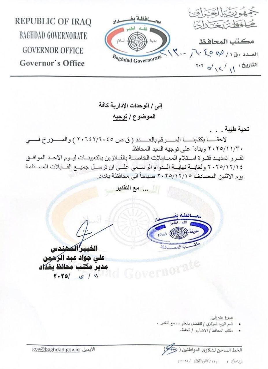 اعلنت مجلس محافظة بغداد، مساء اليوم الخميس، تمديد فترة استقبال معاملات تعيينات العقود.