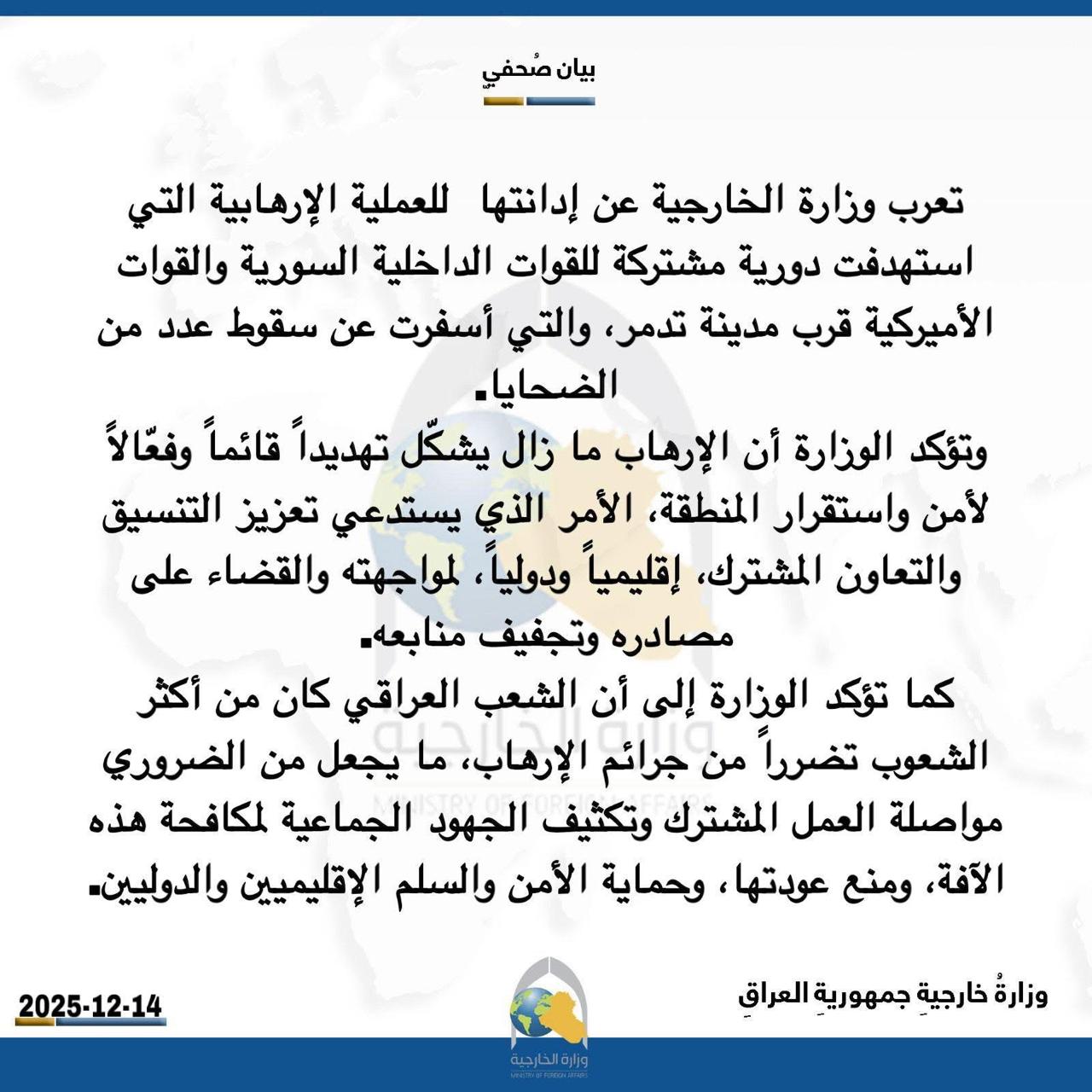 أعربت وزارة الخارجية عن إدانتها للعملية الإرهابية التي استهدفت دورية مشتركة للقوات الداخلية السورية والقوات الأميركية قرب مدينة تدمر، والتي أسفرت عن سقوط عدد من الضحايا.