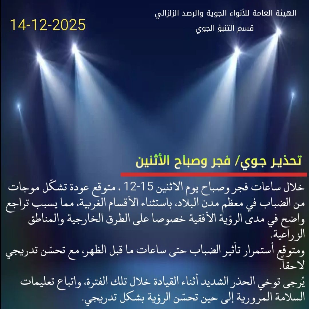 وقال بيان الهيئة تلقته "النهرين"، انه صدر عن قسم التنبؤ الجوي مساء الأحد حول تشكل ضباب كثيف وأنعدام الرؤية فجر وصباح الأثنين 15-12.