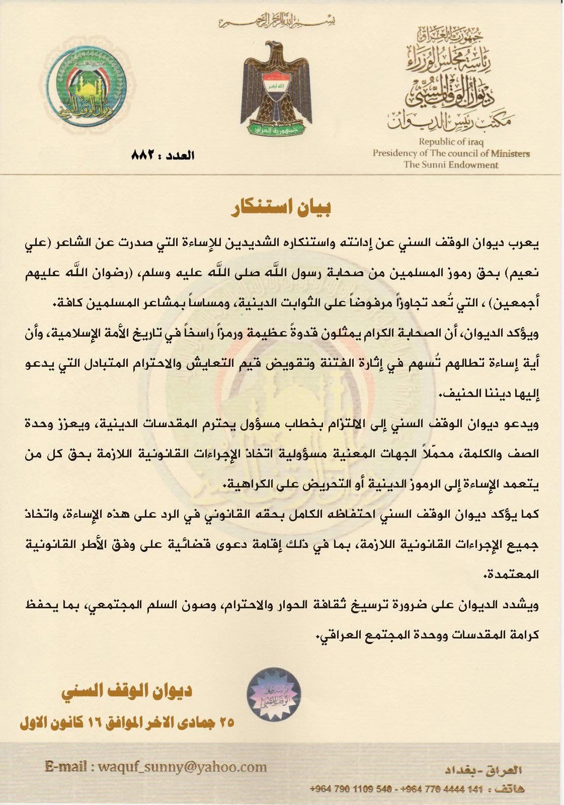 الوقف السني يقيم دعوى قضائية ضد الشاعر "علي نعيم" بتهمة الإساءة إلى الصحابة