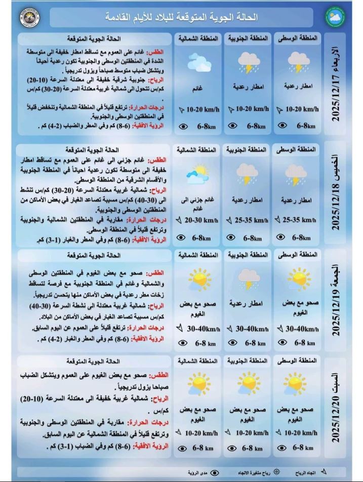 وفي يوم الجمعة، يتحسن الطقس تدريجياً ليكون صحواً مع بعض الغيوم في المنطقتين الوسطى والشمالية، بينما يبقى غائماً في المنطقة الجنوبية مع فرصة لزخات مطر رعدية في بعض الأماكن، مع استمرار نشاط الرياح وتوقعات بتصاعد الغبار.
