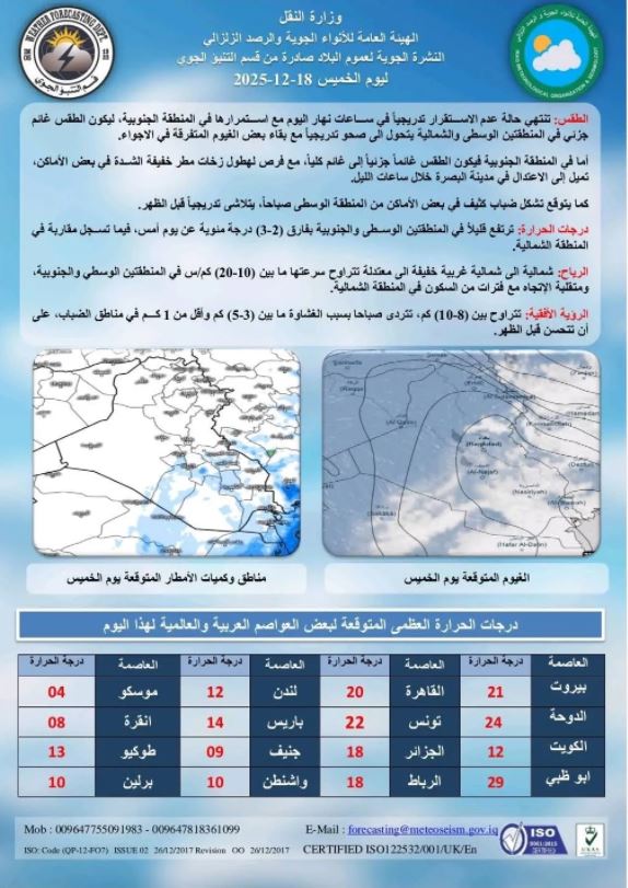 قناة النهرين الفضائية - أعلنت هيئة الأنواء الجوية انتهاء حالة عدم الاستقرار الجوي، مشيرة إلى أن البلاد تشهد طقساً صحواً يترافق مع ارتفاع طفيف في درجات الحرارة.