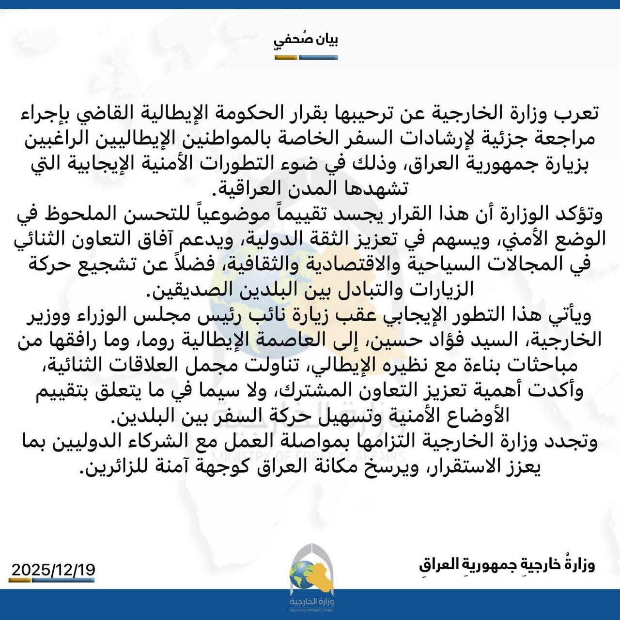 رحب العراق بقرار الحكومة الايطالية الذي يتضمن مراجعة مراجعة ارشادات السفر للايطاليين الراغبين جمهورية العراق.