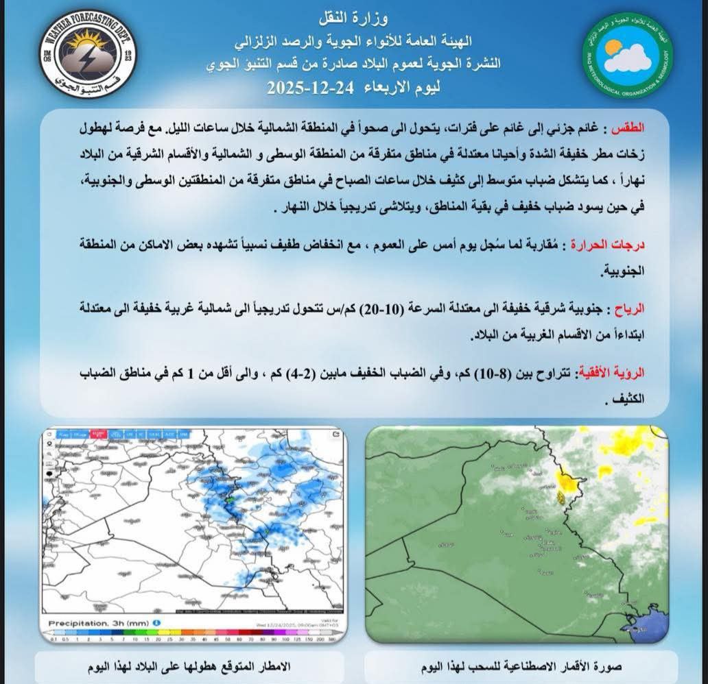 طقس العراق يشهد أمطاراً وضباباً مع انخفاض واضح في درجات الحرارة مطلع الأسبوع المقبل