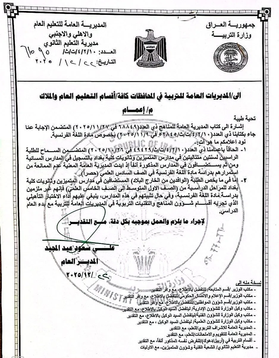 وفيما يتعلق بالطلبة الوافدين من خارج البلاد والمستضافين في مدارس المتميزين وثانويات كلية بغداد للدراسة في الصف الأول المتوسط والصف الخامس العلمي، أوضح الإعمام أنهم غير ملزمين بدراسة مادة اللغة الفرنسية، إلا في حال رغبتهم بذلك، على أن يخضعوا لاختبار تقويمي تجريه أقسام شؤون المناهج والتقنيات التربوية في المديريات العامة للتربية مع بداية العام الدراسي.
