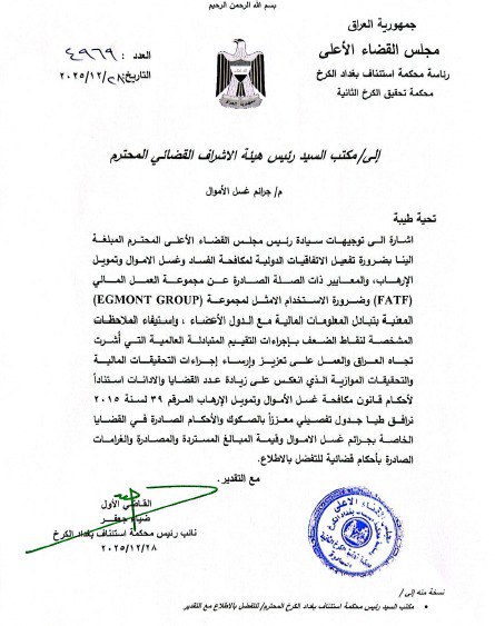 ويذكر ان مجلس القضاء الأعلى شدد على ضرورة تفعيل الاتفاقيات الدولية لمكافحة الفساد وغسل الأموال وتمويل الإرهاب والمعايير ذات الصلة الصادرة عن مجموعة العمل المالي ( FATF ) وضرورة الاستخدام الأمثل لمجموعة (EGMONT GROUP) المعنية بتبادل المعلومات المالية مع دول الأعضاء.