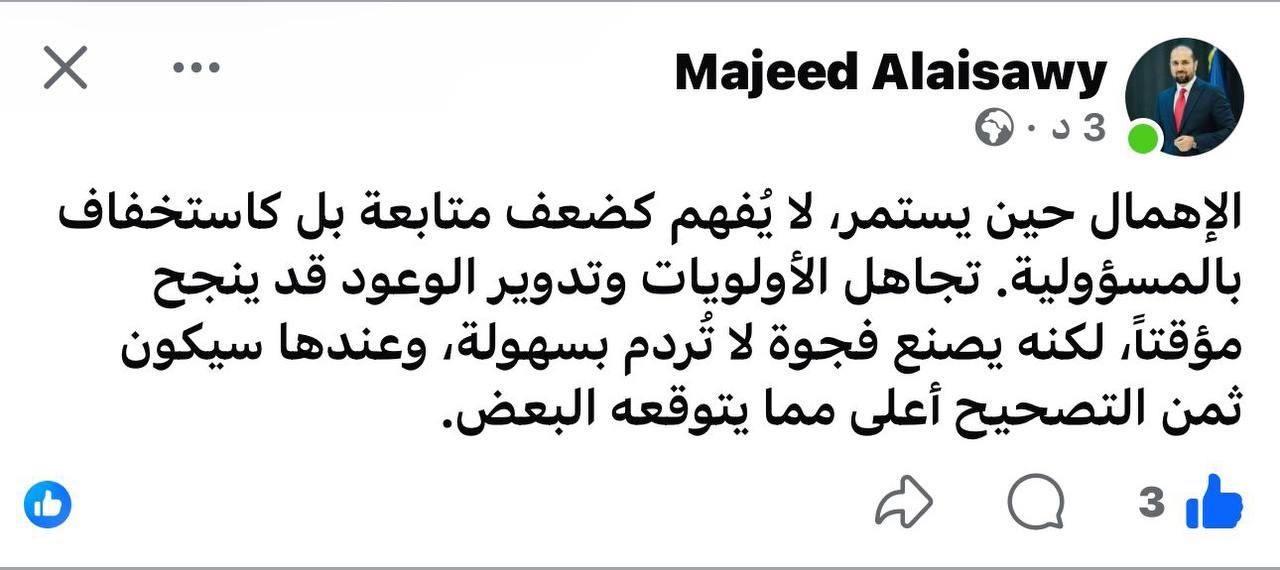 وأضاف أن تراكم الإهمال يؤدي في النهاية إلى دفع ثمن التصحيح بأكلاف أعلى مما يتوقعه البعض، في إشارة إلى احتمال اتخاذه مواقف حاسمة خلال المرحلة المقبلة.