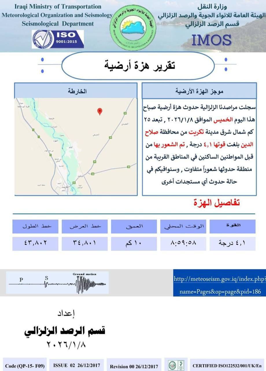 وذكرت الهيئة في بيان تلقته "النهرين" أن "مراصدنا الزلزالية تسجل هزة حدوث هزة ارضية بقوة (4,1) درجة شرق مدينة تكريت من محافظة صلاح الدين".