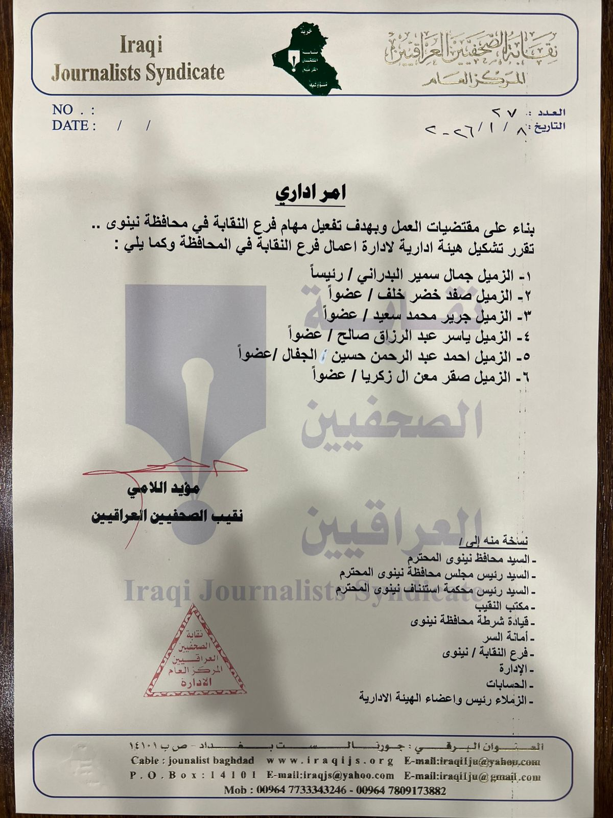وقالت الوثيقة الرسمية التي تلقتها "النهرين" إن الهيئة الجديدة تضم في عضويتها الصحفيين صفد خضر، جرير محمد، ياسر عبد الرزاق، أحمد الجفال، وصقر آل زكريا، وحملت توقيع نقيب الصحفيين العراقيين مؤيد اللامي.