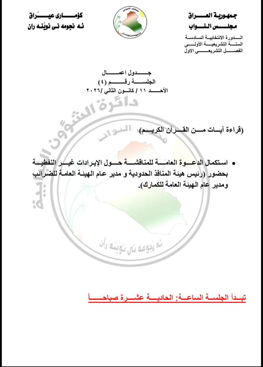 ونشرت الدائرة الإعلامية لمجلس النواب وثيقة رسمية اطلعت عليها "النهرين" أوردت فيها أن الجلسة ستتمحور حول استكمال الدعوة العامة للمناقشة حول الايرادات غير النفطية بحضور رئيس هيئة المنافذ الحدودية ومدير عام الهيئة العامة للضرائب ومدير عام الهيئة العام للكمارك.