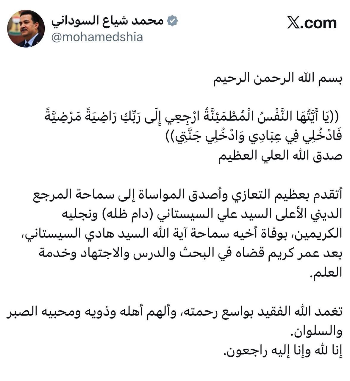 السوداني يعزي المرجع السيستاني بوفاة شقيقه