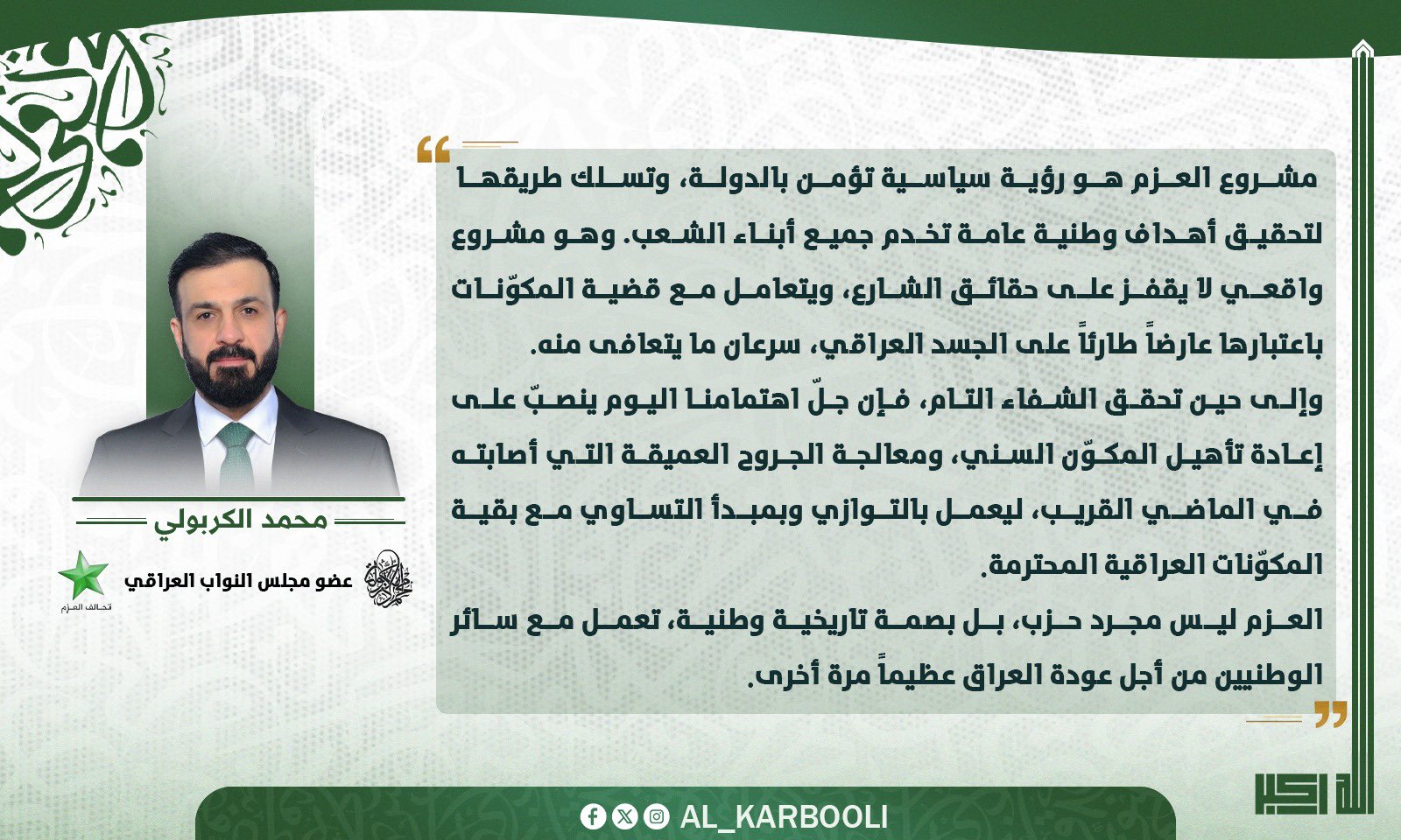 وأضاف أن العزم ليس مجرد حزب سياسي، بل بصمة وطنية تاريخية تعمل مع جميع الوطنيين من أجل عودة العراق عظيمًا مرة أخرى.