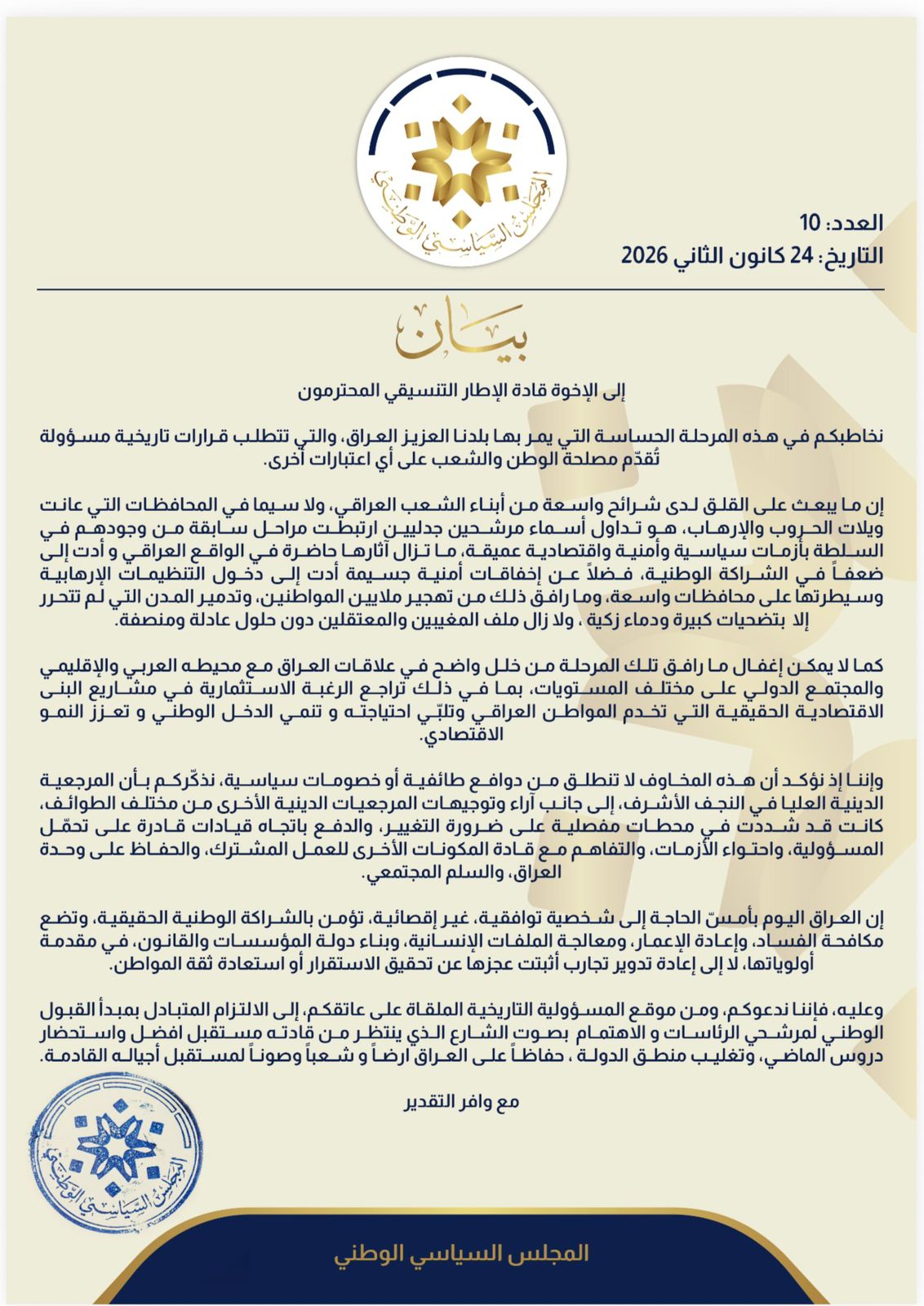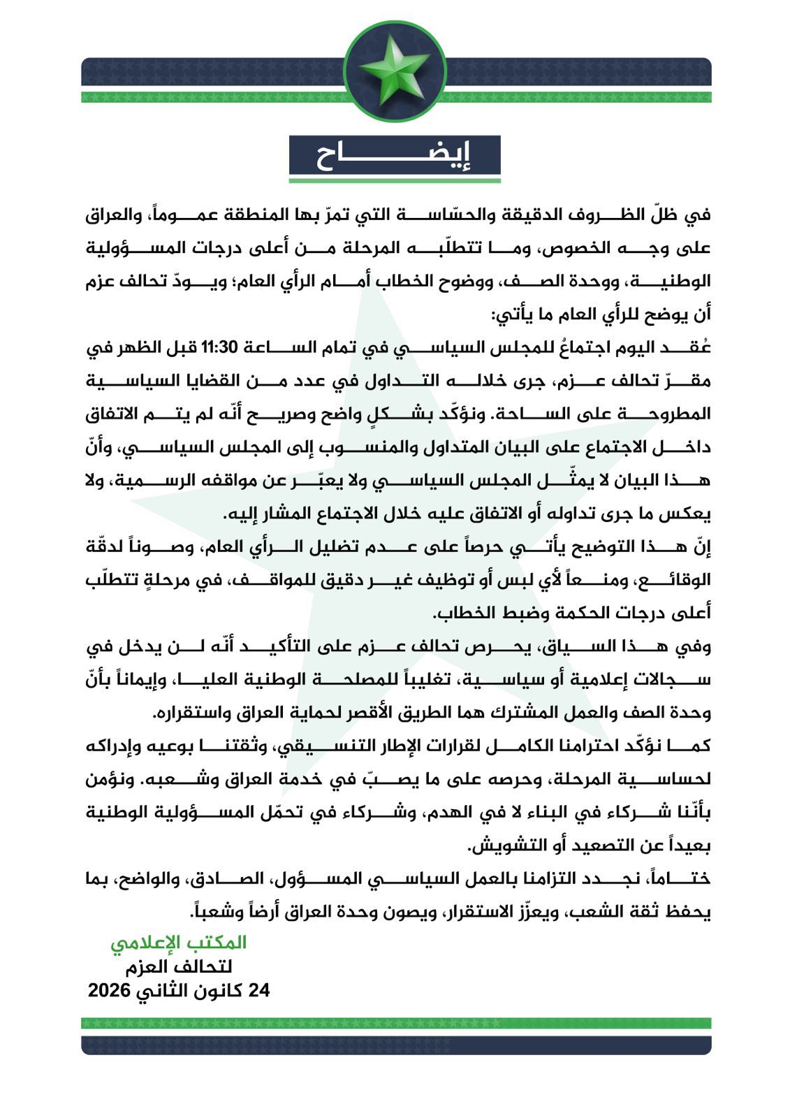 قناة النهرين الفضائية - تبرأ تحالف العزم من بيان المجلس السياسي الوطني، الصادر بتاريخ اليوم السبت.