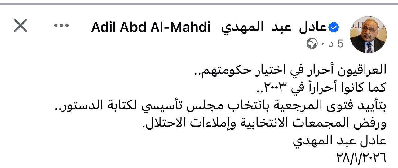 وقال عبد المهدي، في تدوينة على منصة (إكس): إن "العراقيين أحرار في اختيار حكومتهم.. كما كانوا أحراراً في 2003، بتأييد فتوى المرجعية بانتخاب مجلس تأسيسي لكتابة الدستور ورفض المجمعات الانتخابية وإملاءات الاحتلال".