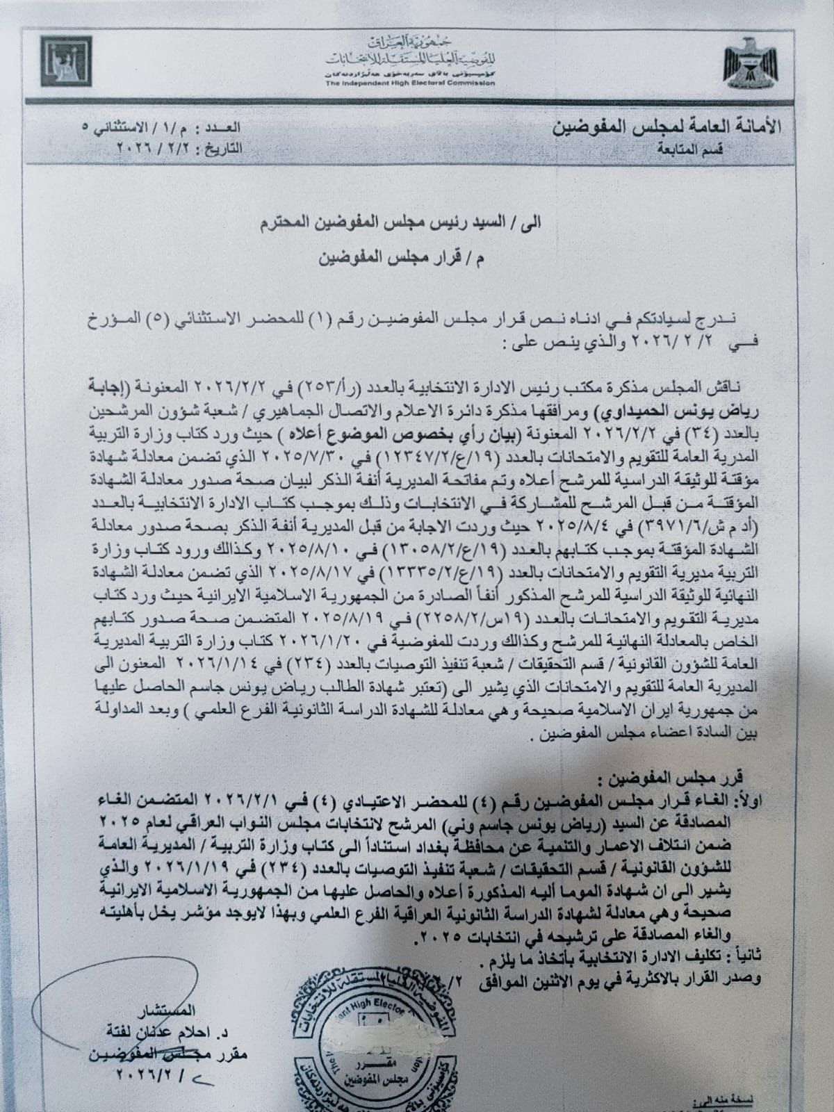 المفوضية تعقد اجتماعاً ثانياً لإعادة النائب رياض الحميداوي لمنصبه بعد استبعاده بسبب تزوير شهادته