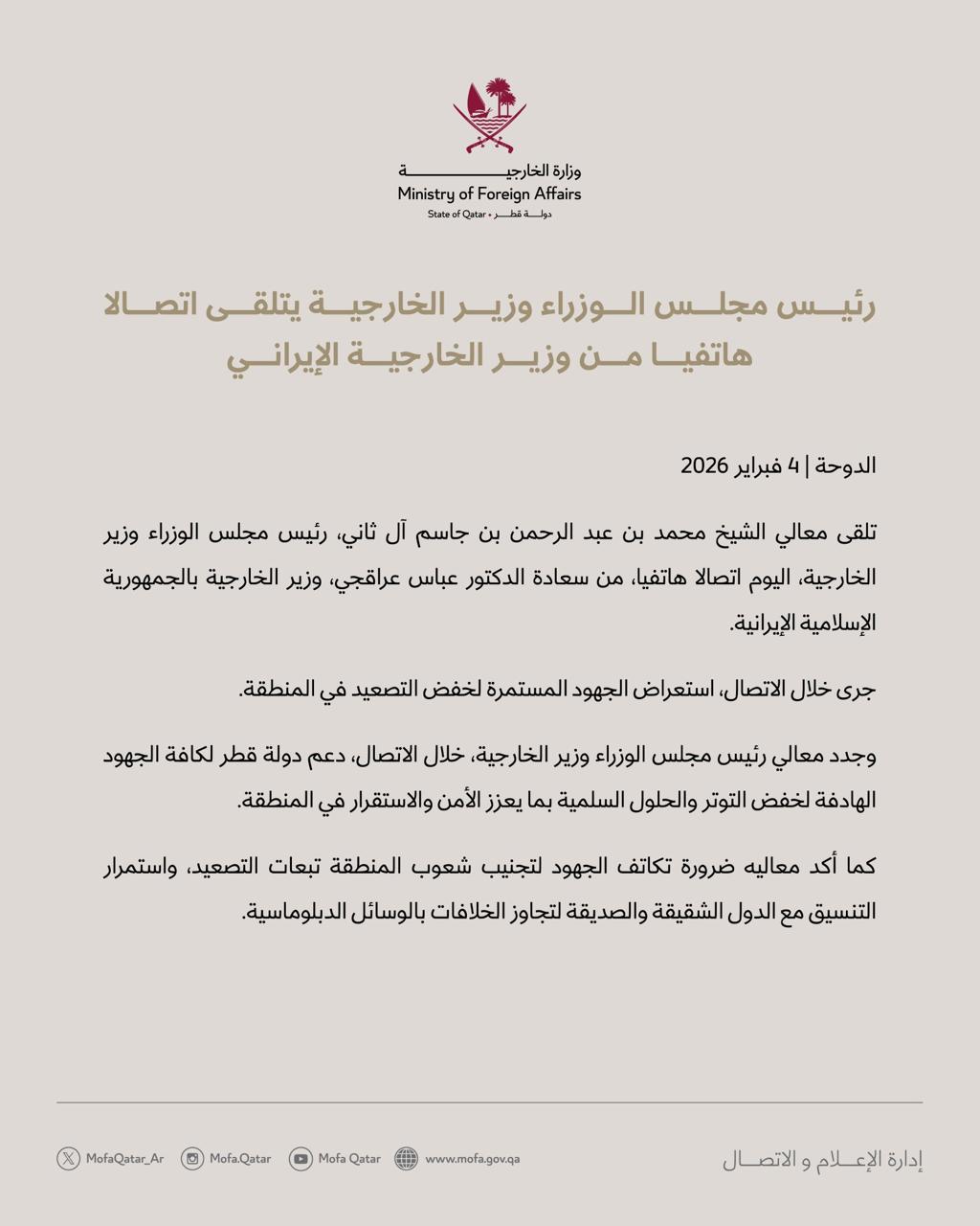 قالت وزارة الخارجية القطرية أن وزير الخارجية محمد بن عبد الرحمن بن جاسم آل ثاني، من نظيره الإيراني عباس عراقجي تلقى اليوم اتصالا هاتفيا، جرى خلاله استعراض الجهود المستمرة لخفض التصعيد في المنطقة.