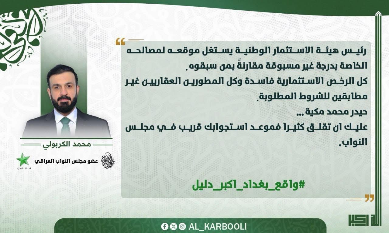 الكربولي وفي تدوينة له على "أكس" أورد فيها أن رئيس هيئة الاستثمار الوطنية يستغل موقعه لمصالحه الخاصة بدرجة غير مسبوقة مقارنةً بمن سبقوه.