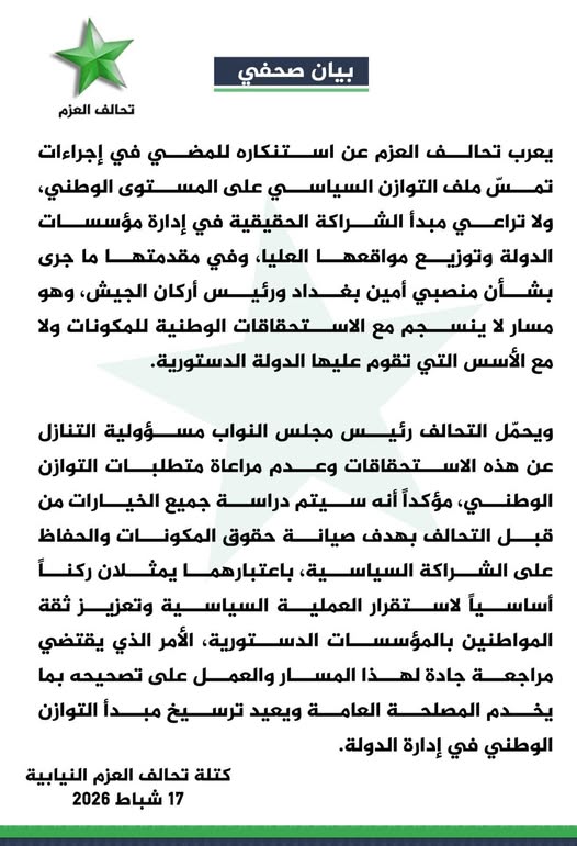 قناة النهرين الفضائية - أعرب تحالف العزم عن استنكاره لما وصفه بالمضي في إجراءات تمسّ ملف التوازن السياسي على المستوى الوطني، مؤكداً أن تلك الخطوات لا تراعي مبدأ الشراكة الحقيقية في إدارة مؤسسات الدولة وتوزيع مواقعها العليا.