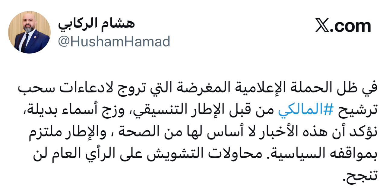 قناة النهرين الفضائية - نفى القيادي في الإطار التنسيقي، الركابي، في تدوينة على حسابه الرسمي، صحة الأنباء التي تحدثت عن سحب ترشيح رئيس ائتلاف دولة القانون، نوري المالكي، من قبل الإطار وإدراج أسماء بديلة له.