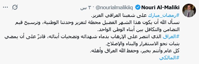 وقال المالكي في تدوينة له على منصة "أكس": "رمضان مبارك على شعبنا العراقي العزيز، نسأل الله أن يكون هذا الشهر الفضيل محطة لتعزيز وحدتنا الوطنية، وترسيخ قيم التضامن والتكافل بين أبناء الوطن الواحد".