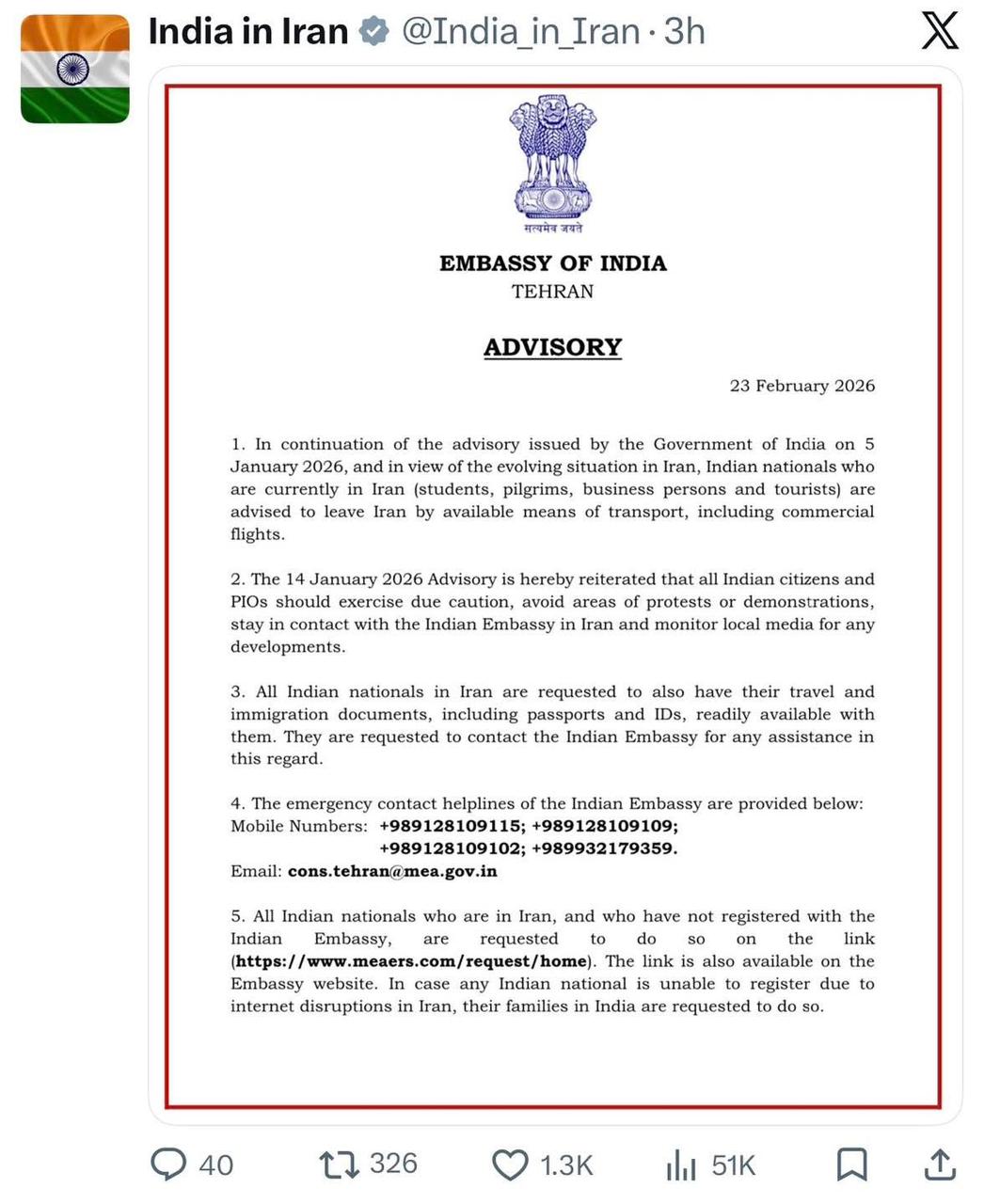 أ ف ب عن السفارة الهندية في طهران: نيودلهي تطلب من رعاياها مغادرة إيران
