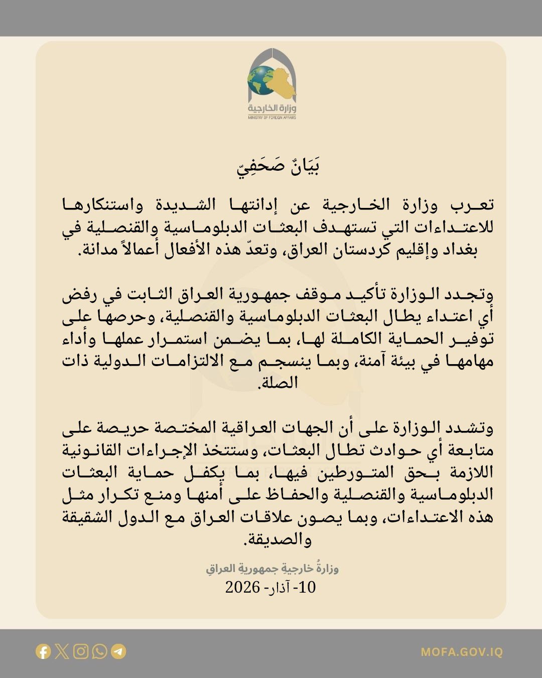 وجددت الوزارة، "تأكيد موقف جمهورية العراق الثابت في رفض أي اعتداء يطال البعثات الدبلوماسية والقنصلية، وحرصها على توفير الحماية الكاملة لها، بما يضمن استمرار عملها وأداء مهامها في بيئة آمنة، وبما ينسجم مع الالتزامات الدولية ذات الصلة".