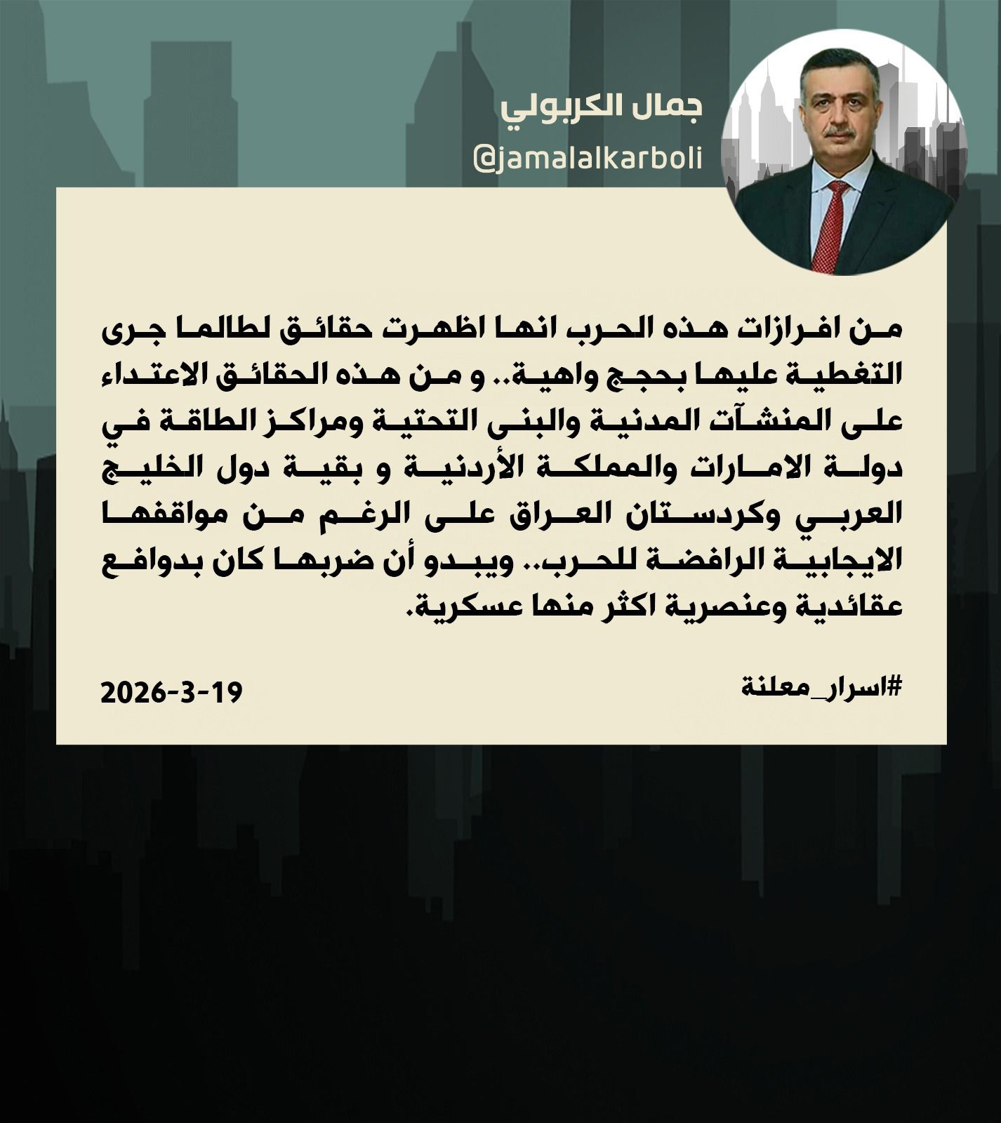 الكربولي في تغريدة له على منصة اكس قال: "من افرازات هذه الحرب انها اظهرت حقائق لطالما جرى التغطية عليها بحجج واهية.. ومن هذه الحقائق الاعتداء على المنشآت المدنية والبنى التحتية ومراكز الطاقة في دولة الامارات والمملكة الاردنية وبقية دول الخليج العربي وكردستان العراق على الرغم من مواقفها الايجابية الرافضة للحرب.. ويبدو ان ضربها كان بدوافع عقائدية وعنصرية اكثر من أنها عسكرية"