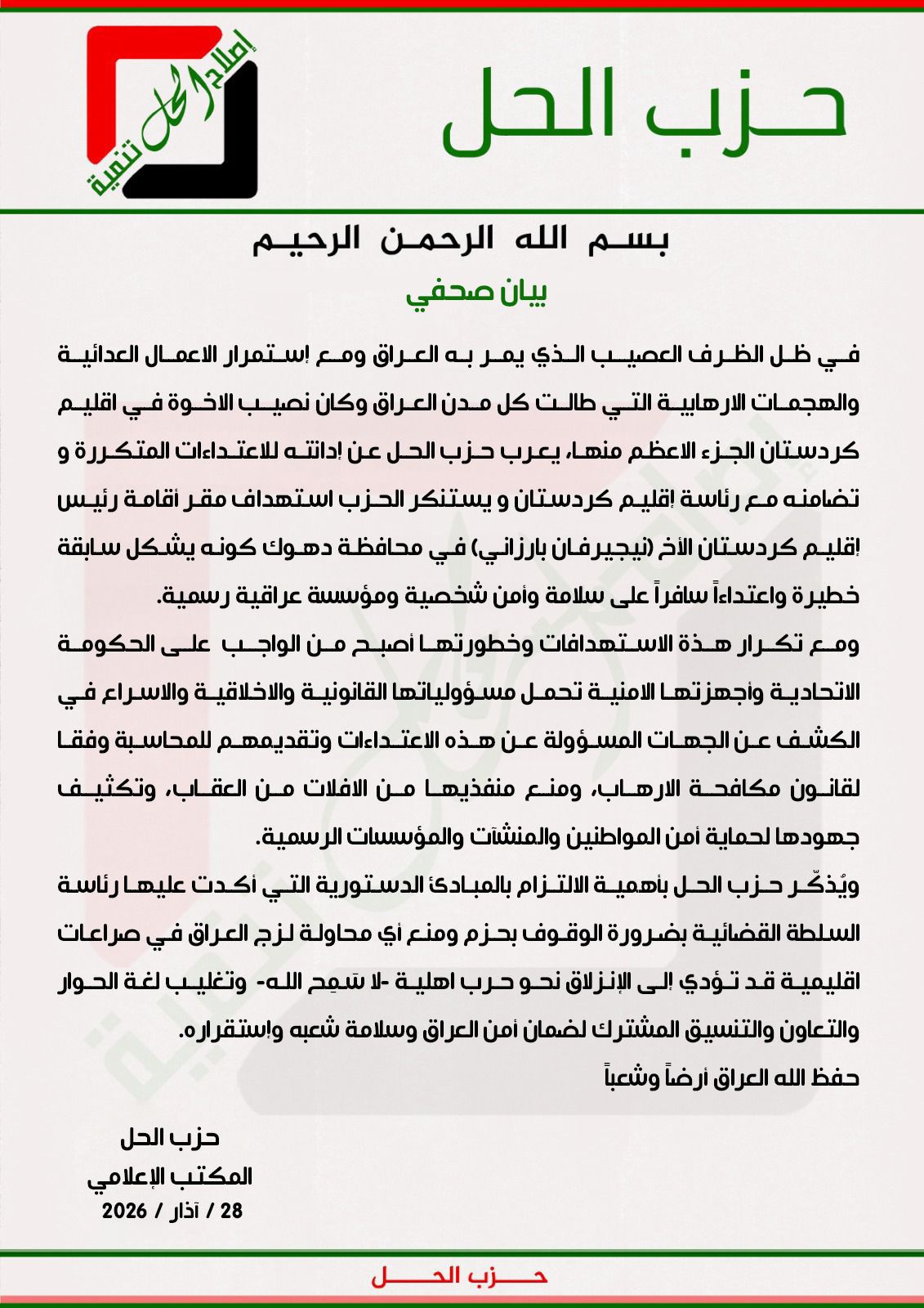 بيان للحزب الحل تلقته "النهرين" ذكر أنه " في ظل الظرف العصيب الذي يعر به العراق ومع استمرار الاعمال العدائية والهجمات الارهابية التي طالت كل مدن العراق وكان نصيب الاخوة في اقليم كردستان الجزء الاعظم منها، يعرب حزب الحل عن إدانته للاعتداءات المتكررة و تضامنه مع رئاسة إقليم كردستان ويستنكر الحزب استهداف مقر أقامة رئيس اقليم كردستان الأخ (نيجيرفان بارزاني) في محافظة دهوك كونه يشكل سابقة خطيرة واعتداءاً سافراً على سلامة وأمن شخصية ومؤسسة عراقية رسمية."