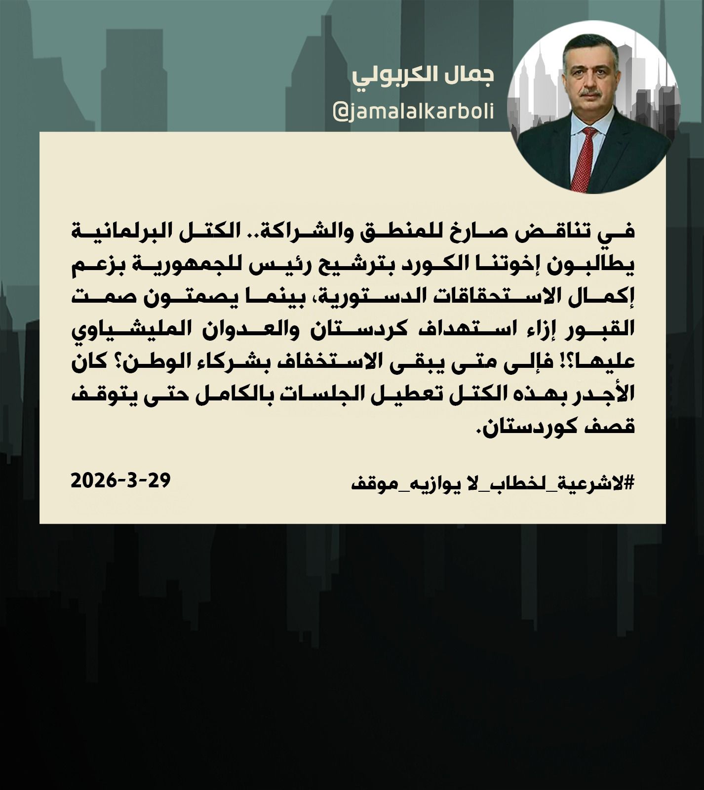 الكربولي، وفي تدوينة له على منصة أكس، قال إن الكتل البرلمانية تطالب المكوّن الكردي بضرورة ترشيح رئيس الجمهورية لحسم الاستحقاقات الدستورية، الا ان هذه الكتل تغض الطرف ازاء العدوان الميليشياوي الذي تتعرض له محافظات الاقليم.