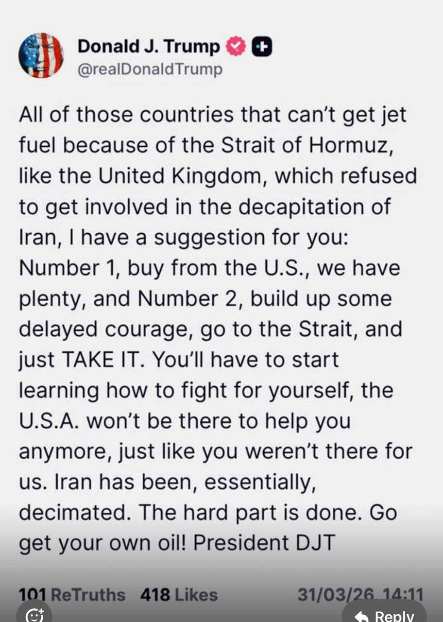 وقال ترمب في منشور عبر منصته "تروث سوشيال" إن بريطانيا من بين الدول التي لم تعد قادرة على الحصول على وقود الطائرات بسبب إغلاق مضيق هرمز، مشيرا إلى أنها رفضت المشاركة في "عملية قطع رأس النظام الإيراني".