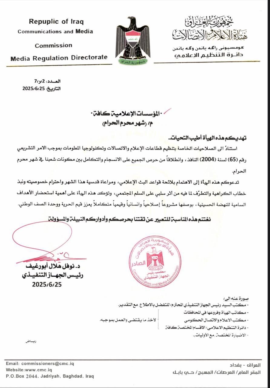 قناة النهرين الفضائية - أظهرت وثيقة رسمية صادرة من هيئة الإعلام والاتصالات تدعو المؤسسات الإعلامية إلى احترام خصوصية شهر محرم ونبذ خطاب الكراهية