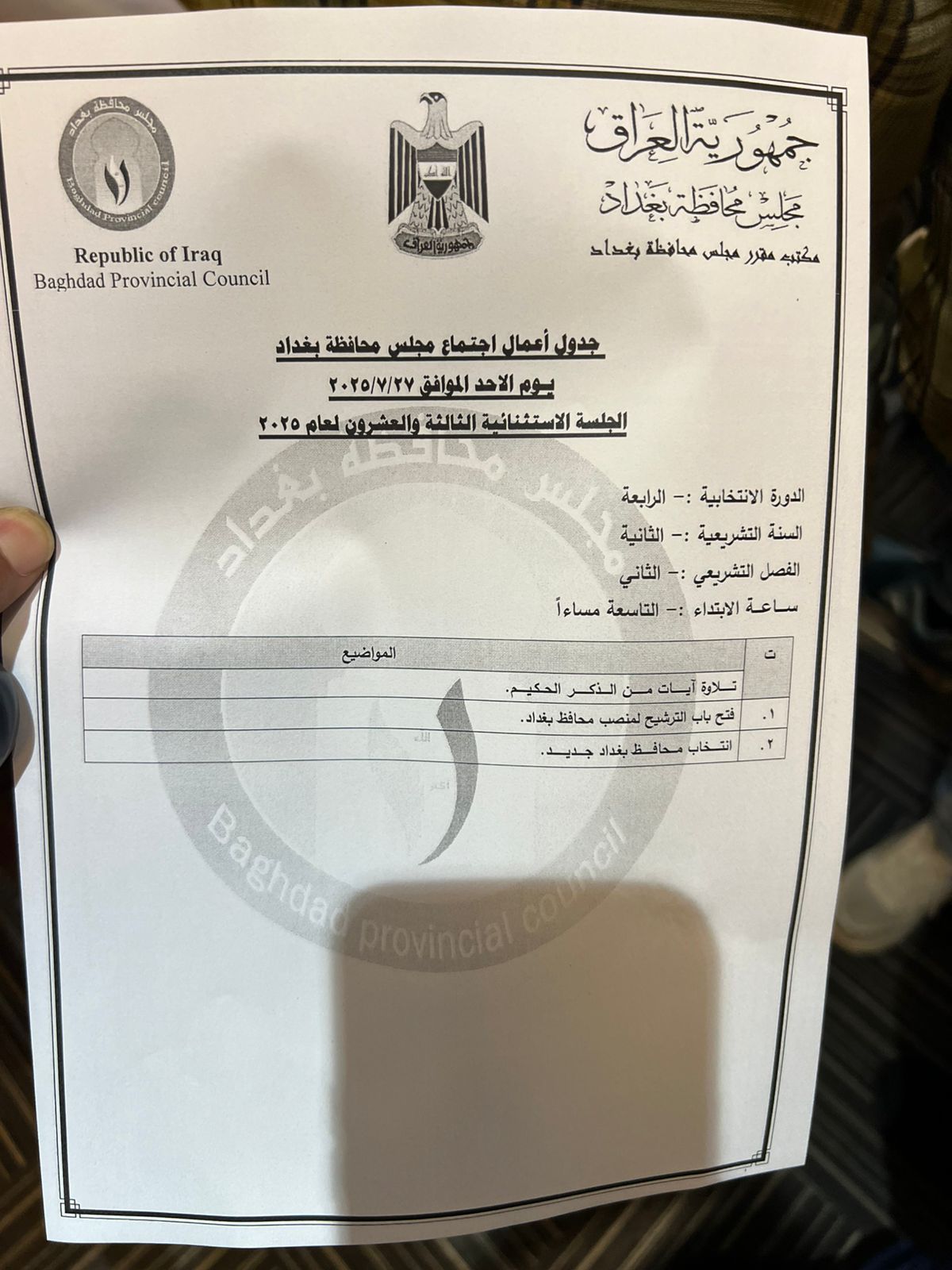وبحسب وثيقة لمجلس محافظة بغداد، فان مجلس مجحافظة بغداد سيفتح باب الترشيح لاختيار محافظ جديد لبغداد.