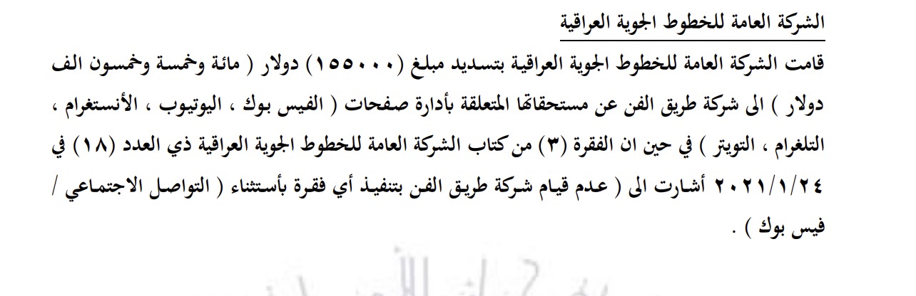 كشف تقرير لديوان الرقابة المالية قيام شركة الخطوط الجوية العراقية بدفع مبلغ 155 الف دولار لاحدى الشركات المعنية بادارة منصات التواصل الاجتماعي الخاصة بالخطوط الجوية رغم عدم التزام الشركة ببنود الاتفاق.