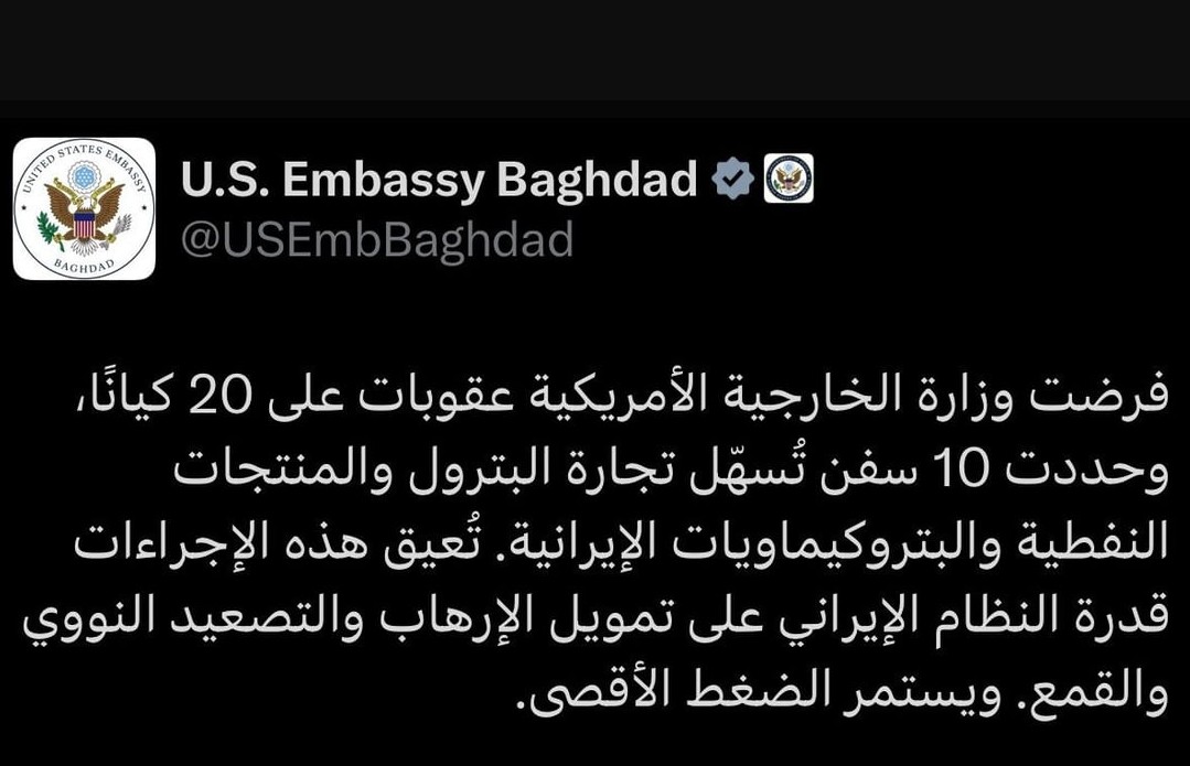 اوضحت السفارة الأميركية في بغداد ، تفاصيل العقوبات المفروضة على 20 كياناً و10 سفن تسهل تجارة البترول والمنتجات الإيرانية، واكدت إن القرار يعيق قدرة طهران على تمويل الإرهاب والقمع.