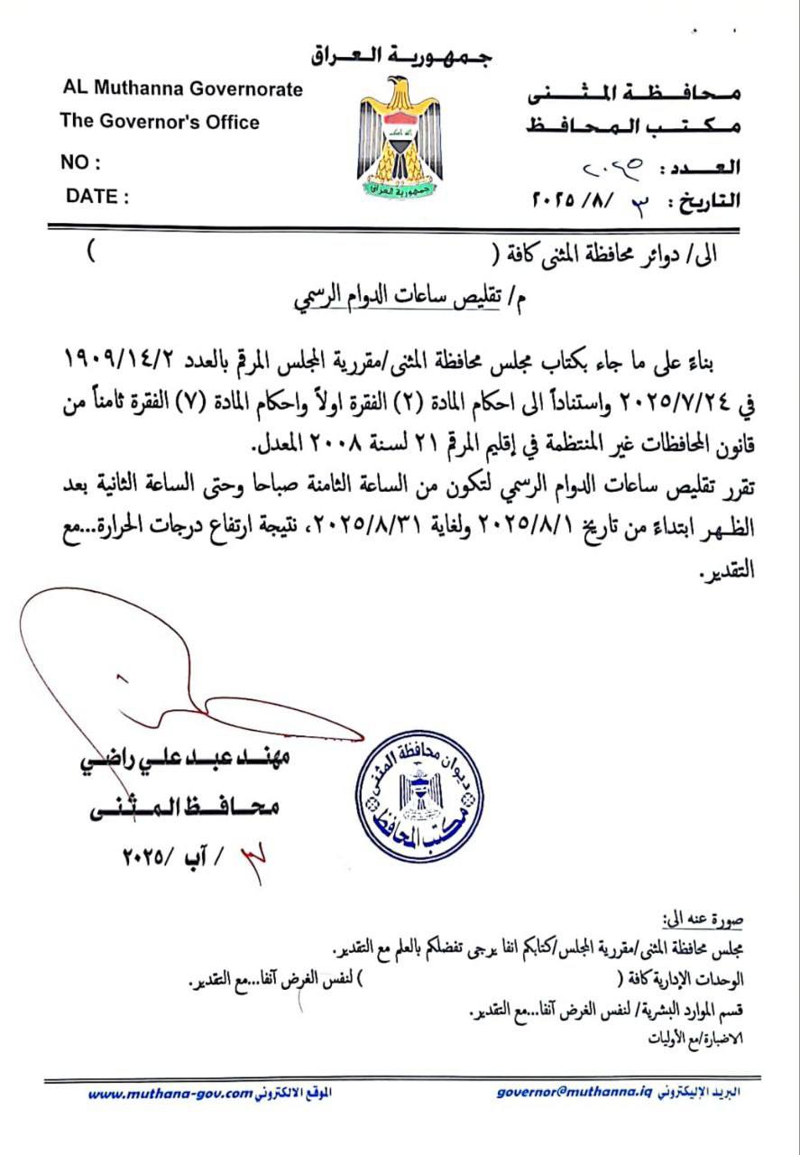 محافظة المثنى تقلص ساعات الدوام الرسمي لشهر آب نتيجة ارتفاع درجات الحرارة