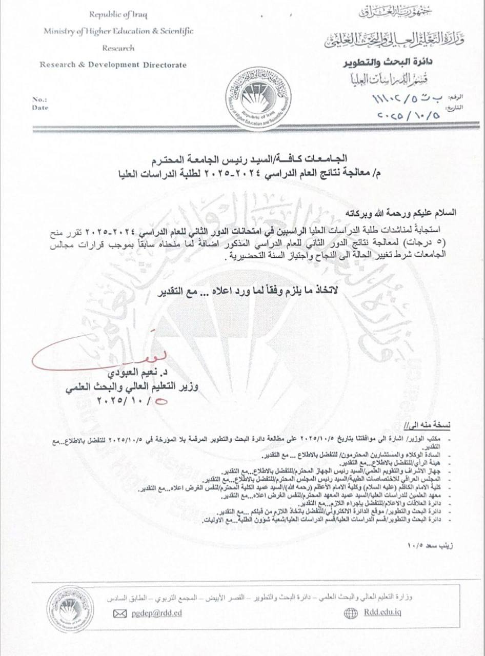 وزارة التعليم تقرر منح 5 درجات لطلبة الدراسات العليا الراسبين بالدور الثاني للعام الدراسي 2024 - 2025