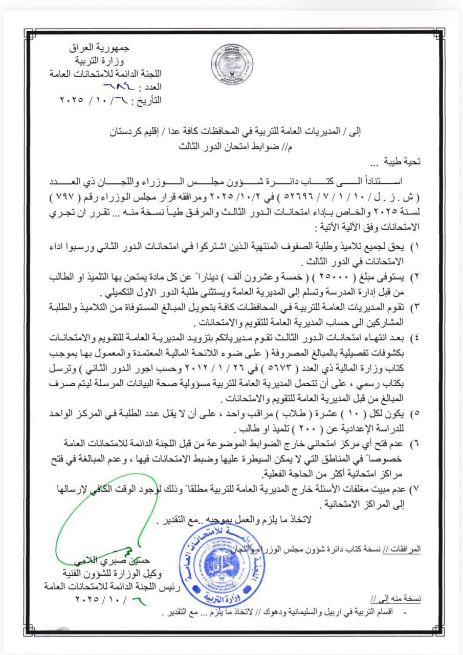 أصدرت وزارة التربية،اليوم الإثنين، ضوابط وآلية أداء امتحانات الدور الثالث للمراحل الدراسية المنتهية