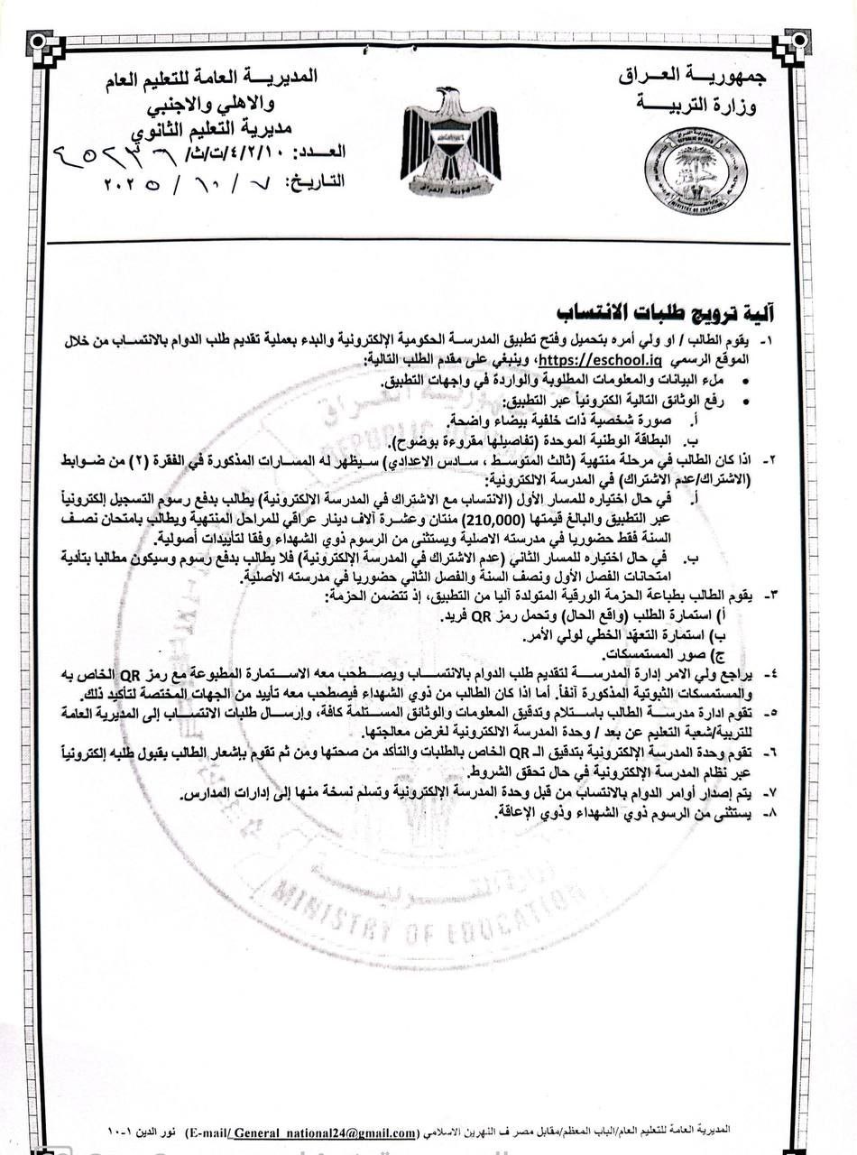 أعلنت وزارة التربية العراقية، اليوم الثلاثاء، ضوابط الانتساب لطلبة المراحل الثانوية، فيما حددت نهاية شهر تشرين الثاني آخر موعد للتقديم.